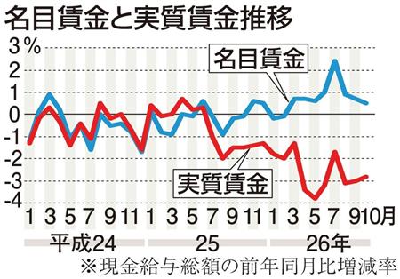 4月の消費税増税などで、物価の変動を考慮した実質賃金が減少している現状も賃上げ機運を高めている。今月2日に発表された10月の実質賃金は前年同月比2・8%減で、16カ月連続のマイナス。金属労協は「家計の低迷が景気回復の足かせだ」(相原議長)と主張する。