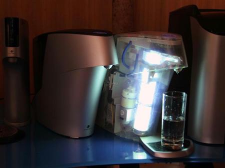 「ウオーターサーバーの中には空気が入っている。水を注ぐときに泡がブクブクと上に上がっているのがその証拠だ。空気が入っているということは、バクテリアが繁殖するということ。また、ボトリングされた水は、環境に負荷が高い。作るために石油や化学薬品を使っているし、リサイクルも十分にできていない。水を運ぶのにも輸送費がかかる。フィルターで濾過するタイプの浄水器はさらに危険だ。フィルターを通した水は味を良くするために、除菌効果のある塩素を取り除いている。そのため、水は無防備で、バクテリアなどが繁殖しやすい状況になってしまう。バクテリアの繁殖を抑えるためには、水を5度以下に保つ必要がある。常温のまま置いておいたら、ものすごい数のバクテリアが繁殖してしまう」