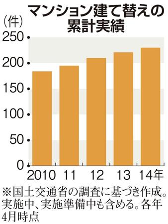 これまでは住民の合意形成が難しく、建て替えが進まなかった。実績は14年4月時点で約1万5500戸にとどまる。新法は、こうした状況を改善するために導入された。マンションを売却する場合、所有者が組合をつくり、デベロッパーに土地と建物をまとめて売り渡すことができるようになった。