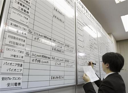 ホワイトボードに回答状況を書き込む関係者=18日午前、東京都中央区(三尾郁恵撮影) トヨタ自動車は18日、平成27年春闘でベースアップ(ベア)に相当する賃金改善分として、月額4千円を回答した。