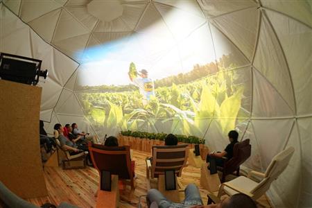 期間限定で設置されたドーム型喫煙スペース「アメスピ ファーム」=名古屋市中区栄 高さ約4.5メートル、幅約7メートルのドーム内に古き良き時代の米国を想起させるフォークロックが流れている。ドーム内側の大きなスクリーンに投影されるタバコ葉が育つ環境の映像をながめながら煙草を一服。広大なタバコ畑の中にいるようだ。身体がリラックスしていく。