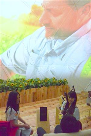 アメスピ ファームではタバコ農園が眼前に広がるタバコ農家のウッドデッキを再現。ドームの周りとスクリーンの前に置かれたヒマワリは害虫を駆除するテントウムシを集めるためのもの。同社の企業理念は「大地に責任を持つ」。有機栽培なのだ。