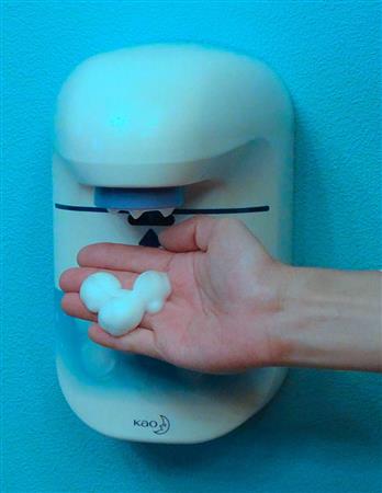 ハンドウォッシングエリアを体験する花王の澤田道隆社長とオリエンタルランドの上西京一郎社長兼COO=千葉県浦安市の東京ディズニーランド ここにも“隠れミッキー”? 東京ディズニーランド(TDL、千葉県浦安市)で1日、ボタンを押すとミッキーマウスの形をした泡が出てくる「ハンドウォッシングエリア」のオープニングセレモニーが行われた。TDL「スプラッシュ・マウンテン」、東京ディズニーシー(TDS)「トイ・ストーリー・マニア!」の2つのアトラクションと合わせて花王がスポンサーとなる。