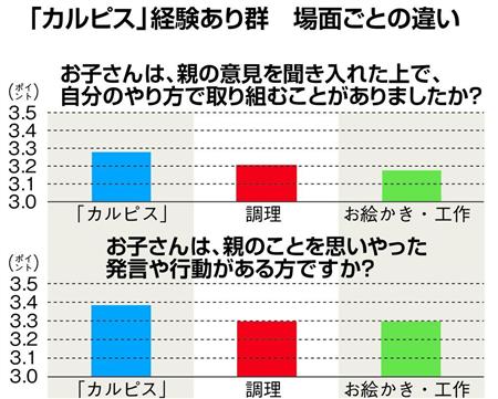 さらに、質問紙による調査では、他の活動の際の子供の様子と比較し、「カルピス」作りは「調理」や「お絵かき・工作」よりも、考える工夫をし、人を思いやる発言や行動が多く見られるという結果が得られている。「カルピス」を作るという作業そのものは簡便かつ安全で、小さな子供にも任せやすい。子供が自分なりに考えて工夫しながら取り組む場面を親が過剰な手出しをせずに見守ることができる。
