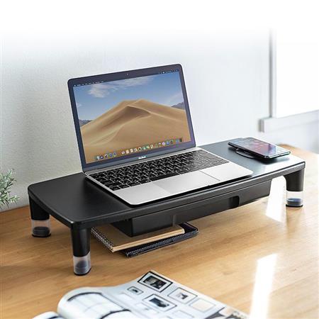 液晶モニターやノートパソコンを本体に設置すれば、画面の位置を上げて見やすくすることができる。机上台の高さは、付属のスペーサーを付け外して2段階(7・10センチ)で調整できる。天板下には筆記具などを入れられる引き出しを搭載し、引き出し下にはスペーサーを付けた状態でキーボード、マウスなども収納できる。価格は6926円(税別)。直営サイトで販売中。