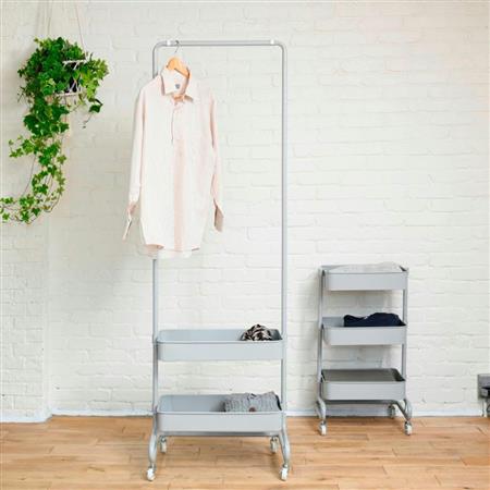 収納用品「バスケットトローリー」とハンガーラックを組み合わせた。ハンガーバーが2段のダブルハンガーとダブルバスケットの2タイプを用意。各5990円前後。販売中。