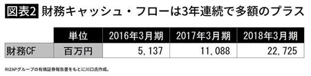 ちなみに、キャッシュ・フロー計算書(CF)の推移を見てみると、金融機関などからの借り入れ、返済を表す「財務活動によるキャッシュ・フロー(財務CF)」は3年連続で多額のプラスとなっている(図表2参照)。財務CFは事業のライフサイクルを表しているといわれ、この値がプラスの会社は「導入期・成長期」にあるのが一般的だ。