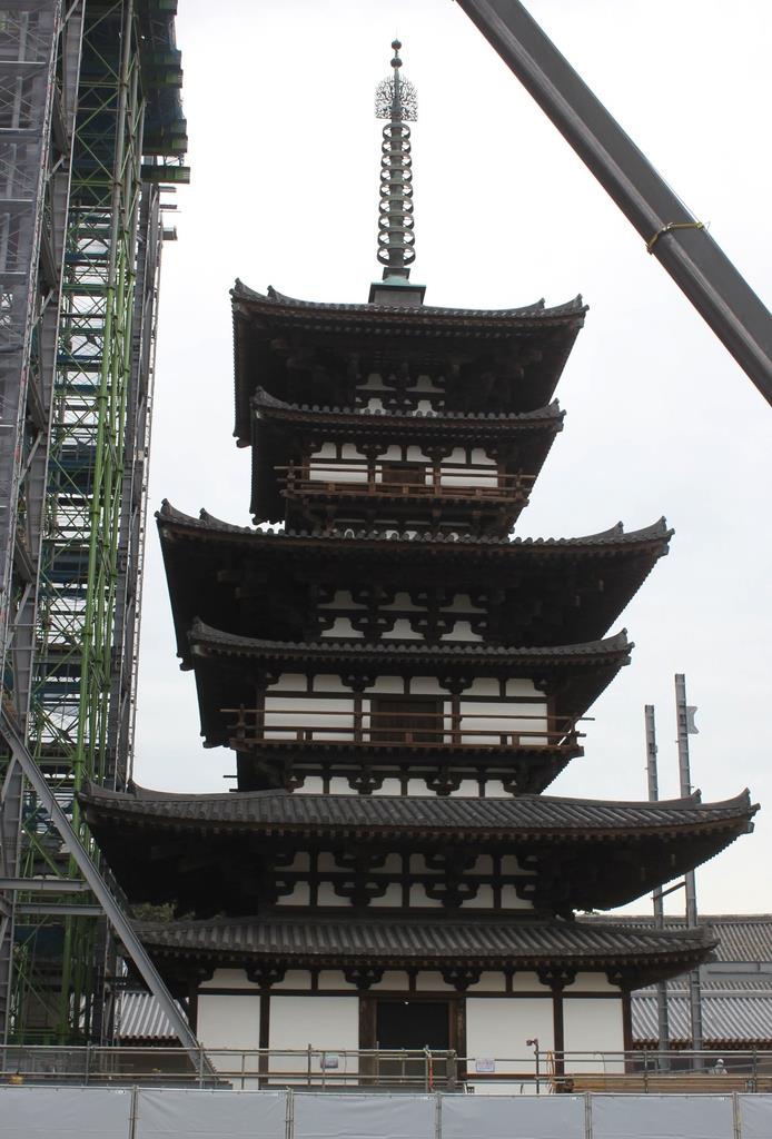 高さ約30メートルにも達する心柱は、上下2本の材でつながれている。下部は創建当初(8世紀)の材だが、上部は14世紀の材。上部は何らかの被害によって取り換えられ、その後も保たれたとみられる。