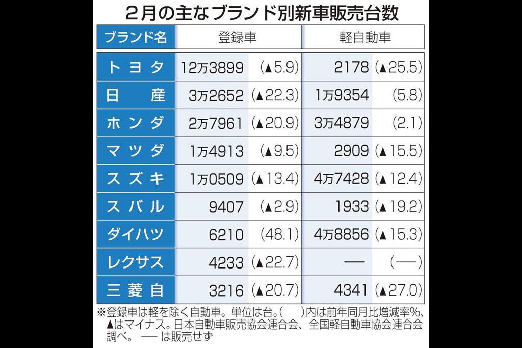 2月の国内新車販売台数は、前年同月比10.3%減の43万185台だったことが2日、日本自動車販売協会連合会(自販連)と全国軽自動車協会連合会(全軽自協)のまとめで分かった。消費税率が引き上げられた昨年10月から5カ月連続の減少。2月は人気小型車の新型投入が相次ぐなどプラス要因があったが、肺炎を引き起こす新型コロナウイルスの感染拡大により、販売店の来客数が伸び悩んだことが響いた。販売関係者は「複合的要因で消費者に先行き不安があるのではないか」と述べ、低迷の長期化を懸念している。