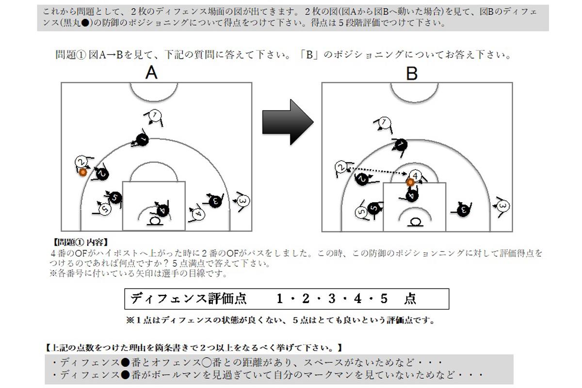 検証は、ある地域の大学バスケットボール連盟の1部リーグと2部リーグに所属する男子大学生110人と女子82人、計192人の「公式大会での実際のプレー」を対象に行われた。対象者が試合でハーフコートディフェンスを行ったシーンを抽出し、オンボール・スクリーンやピック&ロールなどプレーを5領域、21項目に分類。プレー前後の選手10人の位置取りと視線を図に起こした。それらを載せたアンケート用紙を各大学の指導者を通じて被検者に配布。各シーンのディフェンスのポジショニングを5段階で採点し、その点数をつけた理由も記述式で回答を募った。理由は項目ごとに5~8種類に分類した。