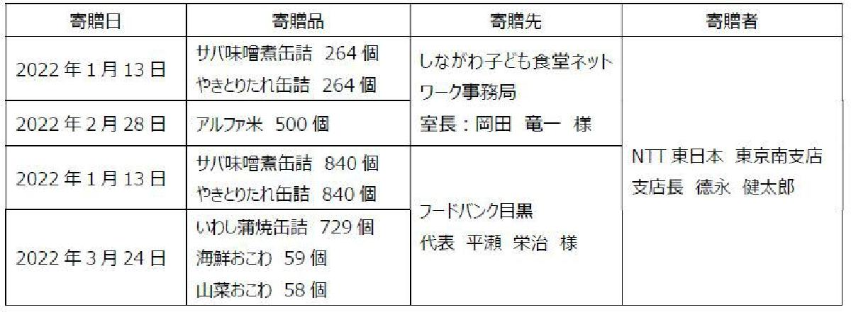 東日本電信電話株式会社 東京南支店(支店長 ●(=徳の心の上に一)永 健太郎 以下、「NTT東日本 東京南支店」)は、「フードバンク目黒(代表:平瀬 英治、東京都目黒区上目黒4-18-25 以下:フードバンク目黒)」および「社会福祉法人 品川区社会福祉協議会しながわ子ども食堂ネットワーク事務局(室長 岡田 竜一、品川区大井1-14-1大井一丁目共同ビル4階、以下:しながわ子ども食堂ネットワーク事務局)」に、弊社が災害時に使用するため備蓄している非常災害用食料品を寄贈しました。