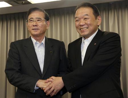 記者会見後に握手を交わすヤマダ電機の山田昇会長(左)とベスト電器の小野浩司社長=13日午後、東京・大手町