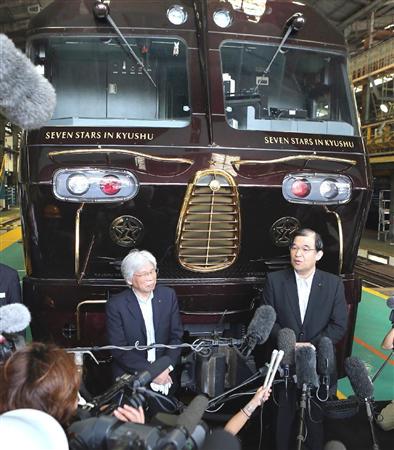 初公開された「ななつ星in九州」の車両前で記者会見に応じる水戸岡鋭治氏(左)と唐池恒二氏。2人の思いが結実した=平成24年9月13日、小倉総合車両センター(安部光翁撮影)
