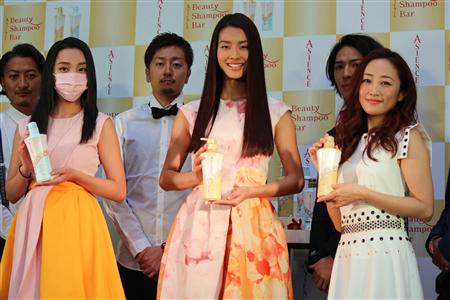 花王が期間限定でオープンしたシャンプーバーのセレモニーには、モデルのすみれさん(左から2人目)らが駆けつけた=22日、東京都港区