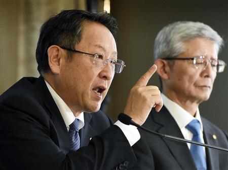 営業利益が過去最高を更新した2014年3月期連結決算について、記者会見するトヨタ自動車の豊田章男社長(左)=8日午後、東京都文京区の東京本社