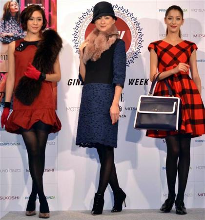 ギンザファッションウィークのオープニングセレモニーに、3百貨店それぞれのテーマをあらわしたファッションのモデルが登場。(左から)プランタン銀座、松屋銀座、三越銀座店=22日午前、東京都中央区