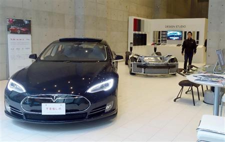 グランフロント大阪のパナソニックのショールームに展示されている米テスラモーターズの新型セダン「モデルS」の車体など=12日、大阪市北区