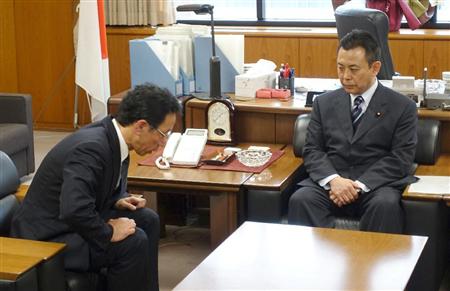 高木陽介経産副大臣(右)に謝罪する福島第1廃炉推進カンパニーの増田尚宏最高責任者=26日、経産省