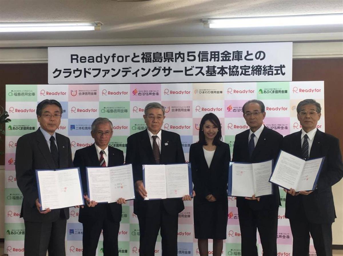 福島県内の信用金庫とクラウドファンディングサービスに関する基本協定を締結したレディーフォーの米良はるかCEO(右から3人目) =2016年11月、福島市(同社提供)