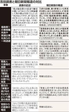 しかし調書を入手した産経新聞は8月18日、命令違反の撤退はなかったと報じ、読売なども同様に続いた。それが事実である。会見で木村社長は「命令違反し撤退」の記事を取り消すなどとし、12日付朝刊でも社長名で「みなさまに深くおわびします」とする記事を載せた。慰安婦報道についても、慰安婦を「強制連行」したという故吉田清治氏の虚偽をもとにした誤報と、訂正が遅きに失したことを謝罪した。朝日は8月5日の自社検証で故吉田清治氏の記事を取り消すとしたが、謝罪はしていなかった。