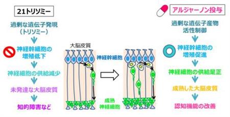 研究グループは、この神経幹細胞の増加を阻害しているのが、異常を起こす染色体にある遺伝子「DYRK1A」だと突き止め、この遺伝子の働きを抑制する化合物を発見した。その化合物が「アルジャーノン」だという。