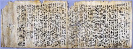 吉原氏によると、刀剣書は刀工の名前や代表作、系図などが記載されている専門書。1351年に書かれた2枚の古文書(それぞれ縦約33センチ、横約48~49センチの継ぎ紙)の裏に墨で記録されていた。肥前の豪族、龍造寺氏が足利氏から借りた秘本の刀剣書を書き写したものと推定される。