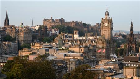 カールトンヒルからエディンバラ旧市街を望む。エディンバラ城を含む重要施設はイングランド軍の攻撃を避けるため岩山の上に建てられていた