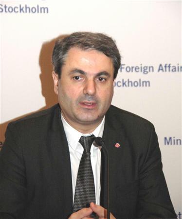 会見に応じるスウェーデンのエネルギー担当相、イブラヒム・バイラン氏=4日、ストックホルム市