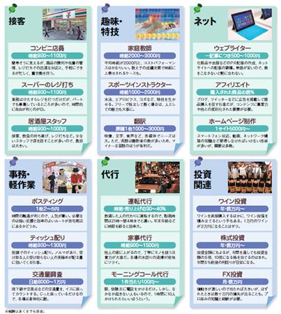 確実に稼ぎたいのなら、昼は会社員、夜はファミレス店員というような時間の使い分けがいい。ファミレスやコンビニ、居酒屋のような接客は学生アルバイトの独壇場と思いがちだが、あるファミレスの関係者によれば「年配のお客さまが増えているので気配りのできる社会人や主婦が欲しい」という。注文のサラダをテーブルへ運ぶときに、頼まれなくても取り皿を用意するような気配りは、社会人だからこそできること。
