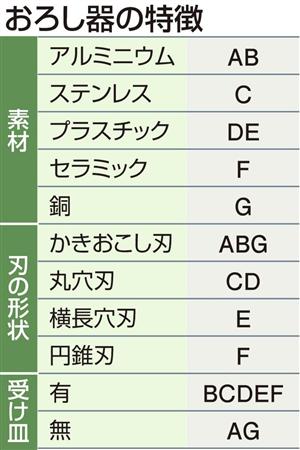 実験に使ったおろし器。上段左から時計回りにA、B、C、D、G、F、E おろし煮や鍋の薬味など大根おろしが活躍する季節。作るのに特別な技術はいりませんが、意外に力のいる作業です。受け皿の有無や刃の形状、おろし面の素材などが違う7種類のおろし器を比較しました。