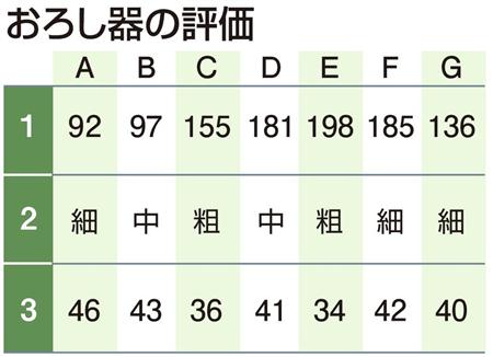 大根おろし一定量を茶こしに入れて2分間おき、水切り量(%)を測定すると、C、Eの量が目立って少なく、粒の粗さを裏付ける結果になりました。次いで水切り量が少なかったGは粒が細かかったことから、鋭い刃でつぶさずに切り取れたことが分かりました。逆にAは細かくて水分量が多いため、辛みが強くなりやすいといえます。