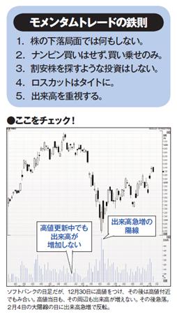 つまり、市場ではやっている(買われている)企業の業績が現在の株価に見合うかどうかなどの判断をしないということ。企業名を知らなくても、みんなが買っているから買うというトレードです。