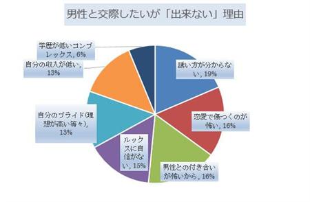 「男性と交際したいとは思うが、実際は交際したことがない」と回答した女性を対象に、その理由についてアンケート調査を行った結果、「誘い方が分からない」が最も多く19%という結果となった。続いて「恋愛で傷つくのが怖い」「男性との付き合いが怖いから」がそれぞれ16%、「ルックスに自信がない」が15%、「自分のプライド(理想が高い等々)」と「自分の収入が低い」がそれぞれ13%、「学歴が低いコンプレックス」が6%という結果となっている。