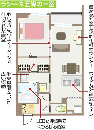今年11月に入居を開始した京都市下京区のシングル女性向けの賃貸住宅「ラシーネ五條」。スタイリッシュなバスルームや、自然光が差し込む場所に大きな鏡がついた化粧カウンターなど、女性が魅力を感じる機能をいくつも備えている。