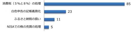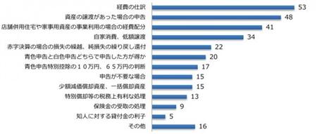 初心者が判断しにくい項目として「経費の仕訳」と回答した専門家が半数を超えた。購入した備品は経費計上か資産計上か、飲食費は接待交際費か交際費か、また、自宅を事務所にしている場合の家事按分の方法など、経費の計上には専門的な知識が必要になる。また、約半数の専門家が「資産譲渡があった場合の申告」が初心者には判断しにくいと回答。譲渡所得の区分、総合譲渡か分離譲渡か、取得原価不明の場合の申告などは知識がないと判断しにくい項目だ。