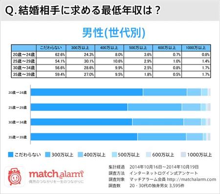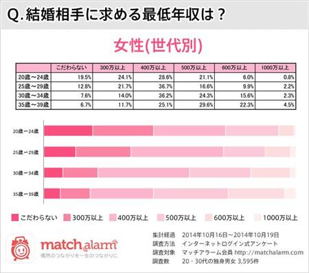 更新Facebookを活用した婚活アプリ「マッチアラーム」を運営・開発するマッチアラーム株式会社は、独身女性3595名を対象に、恋活・婚活に関する調査を実施した。調査の結果「結婚相手に求める最低年収は?」という質問に対して、女性の6割が「500万未満」と回答。年齢が若いほど、結婚相手に求める年収が低くなる傾向となった。