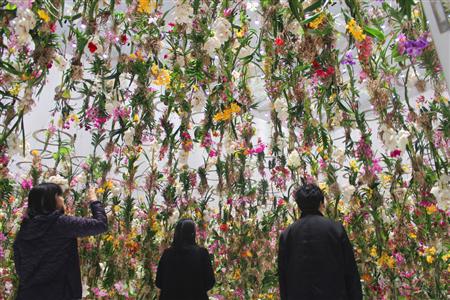 生花約2300本を使ったチームラボ最新作『Floating Flower Garden - 花と我と同根、庭と我と一体と』=日本科学未来館(日下紗代子撮影) 花の香りに誘われて、7階の展示室に向かう。案内された狭い部屋の中には、大量の生花が天井から吊るされていた。その数2300本以上。足首の高さくらいまでぎっしりだ。中に入ると、とたんに目の前の花が動きだし、前に進むごとに上がり、振り返ればまた下がっていく-。(産経デジタル 日下紗代子)