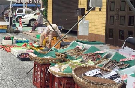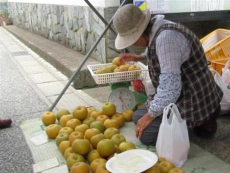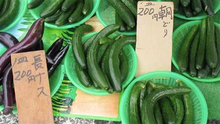 平日は約20~約40店、土日祝日は約70店が道の両脇に並ぶ。カツオやアジ、トマト、ナス、梨などに立ち止まると、珍しい野菜の食べ方を教えてくれたり、試食をすすめられたり。地元の人との対面でのやりとりも楽しい。