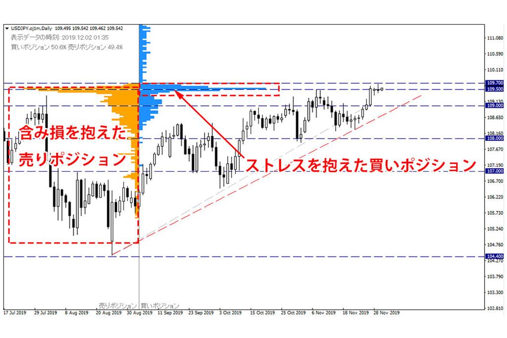 一方で、後半の伸び悩みでうまく利益が伸びず、ストレスを抱えている買いポジションも少し増えており、価格が下押しするような状況となると、これらのポジションの損切りの売りが増える可能性にも少し注意が必要です。