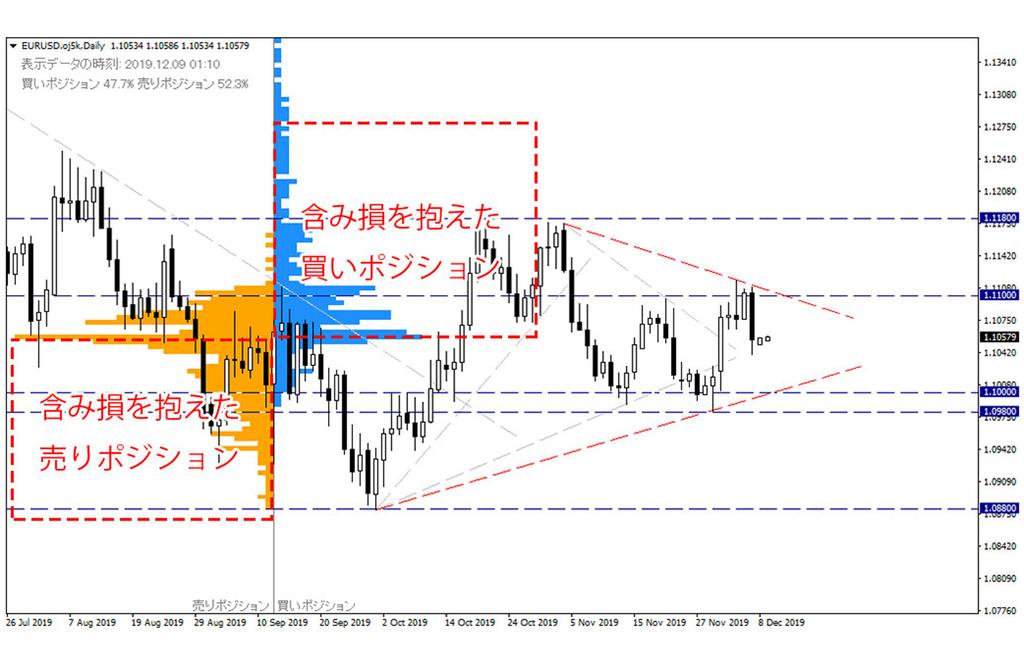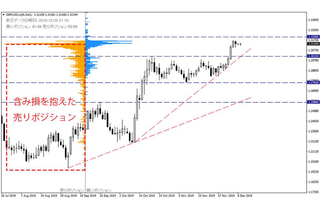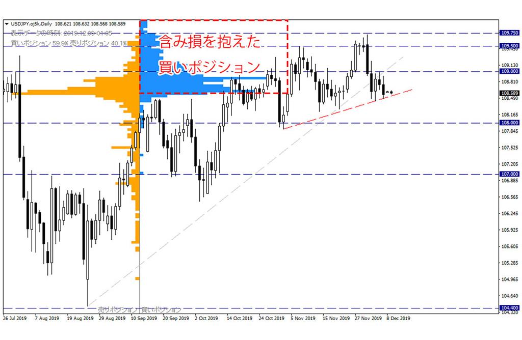 OANDAのオープンポジションを見ると、買いポジションに傾くなか、その多くが含み損を抱える苦しい状況に追い込まれており、安値を切り下げる動きとなると、損切り(損失を増やさないための決済注文)の売りが増えそうな気配となっており、下落が勢いづく可能性を見出すことができます。