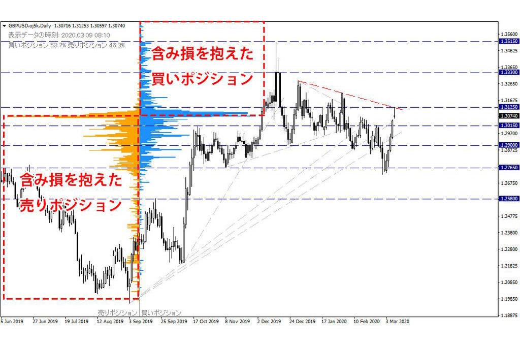 OANDAのオープンポジションを見ると、下落基調が続いたことにより、含み損を抱えた買いポジションが多く、反発したところでは、損益分岐点に戻ってきたことによる安堵の決済の売り、安値を切り下げる動きとなった場合は損切りの売り注文(損失拡大を防ぐための決済注文)が増えることが想定され、上値の重い状態が続く可能性が考えられそうです。