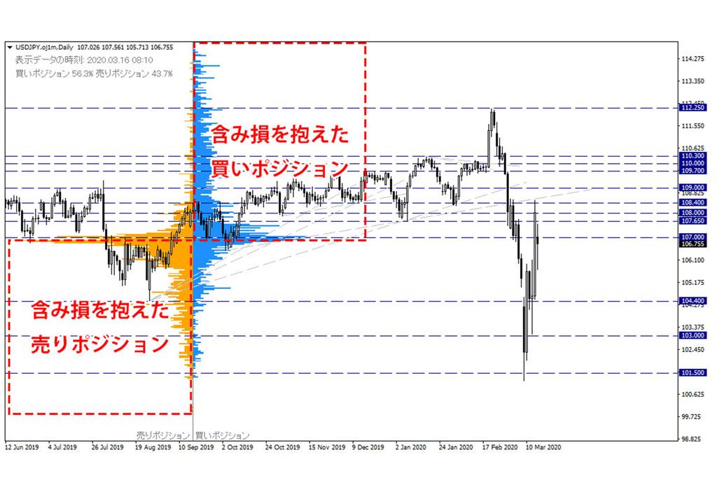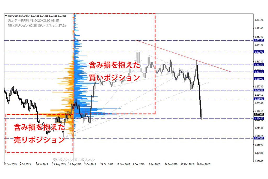 OANDAのオープンポジションを見ると、やや買いポジションに偏っていますが、含み損を抱えた買いポジション、売りポジションが比較的バランスよく並んでおり、力が均衡しているように見えます。