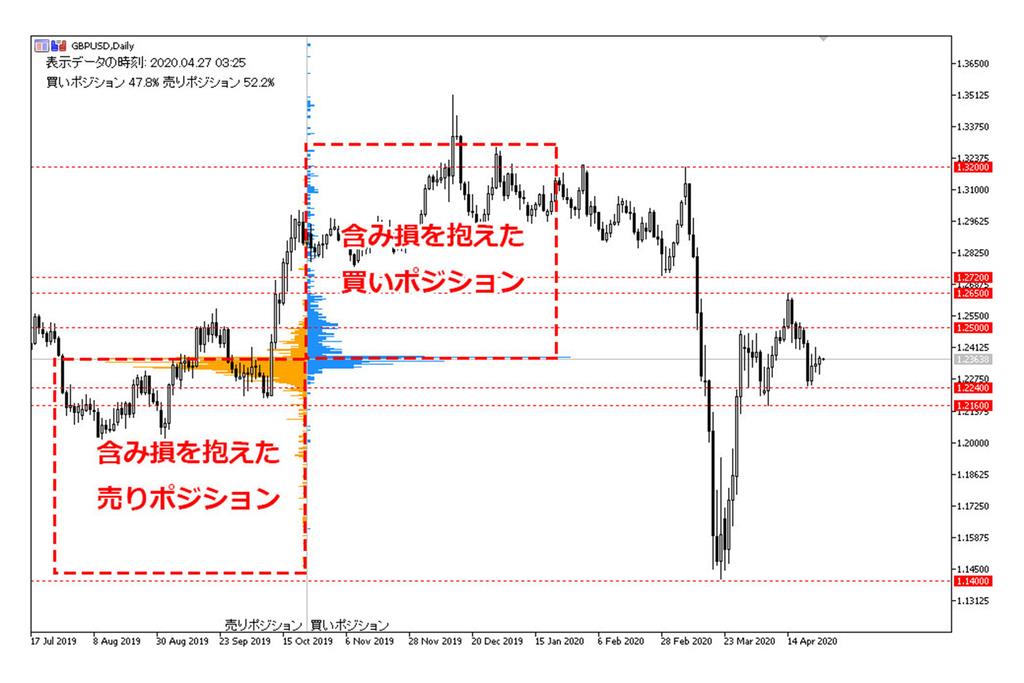 オープンポジションを見ると、どの水準に含み損を抱えたポジションが多いかを視覚的にチェックすることができ、次にどちらに動いた方が、価格の動きが大きくなりそうか(損切り注文が多く出そうか)を予想することができます。