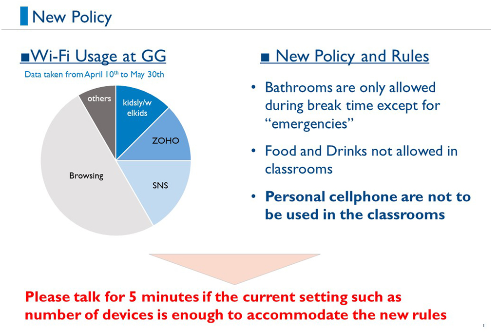 「ネット使用内容を判断する機能付きwifi」なんていうものはありませんし、携帯電話は業務上、連絡帳アプリ などを使用するため必要です。トイレに行くたびに時間を計ることはしませんし、もちろん私語も許されます。GGインターナショナルスクールは、いつも話し声が聞こえ、和気あいあい、にぎやかでとてもエネルギッシュな場所です。雑談がなくなるというのは、学校の魅力を取り上げるようなものです。本当にこのような規則を導入したら、生徒や先生のために、私を社長の役職から引っ張りおろして下さい。