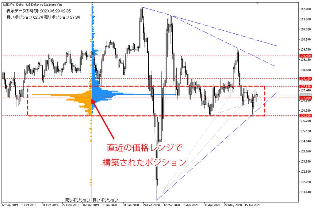 OANDAのオープンポジションを見ると、直近の価格レンジである1米ドル=106.00-107.65円付近で構築されたポジションが多く、このレンジをしっかりと上下に抜ける動きとなると、売買のいずれかのポジションの損切り(損失拡大を防ぐための決済の取引)が増え、価格に方向感が出てくる可能性が考えられそうです。