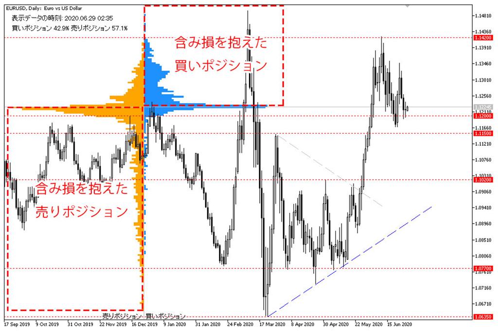 オープンポジションを見ると、どの水準に含み損を抱えたポジションが多いかを視覚的にチェックすることができ、次にどちらに動いた方が、価格の動きが大きくなりそうか(損切り注文が多く出そうか)を予想することができます。