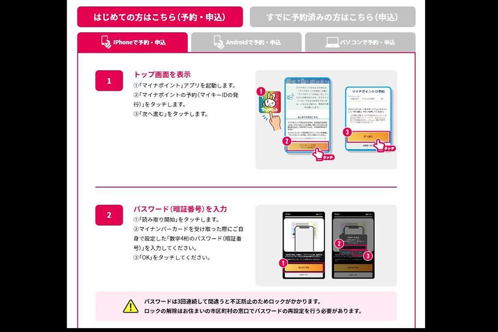 PCから予約をする場合はICカードリーダーを使い、公式Webサイトから手続きを行う。アプリやWebサイトからマイナポイントの利用に必要なID「マイキーID」を発行する。