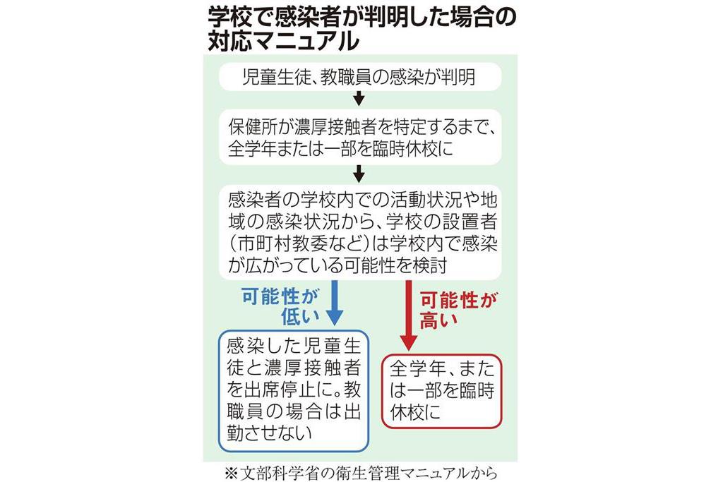 学校内で感染者が確認された場合の対応について、文部科学省は6月に改訂した学校向けの衛生管理マニュアルで、感染者とその濃厚接触者が児童生徒なら出席停止、教職員なら出勤させないようにし、保健所などと連携して校内を消毒するよう要請している。
