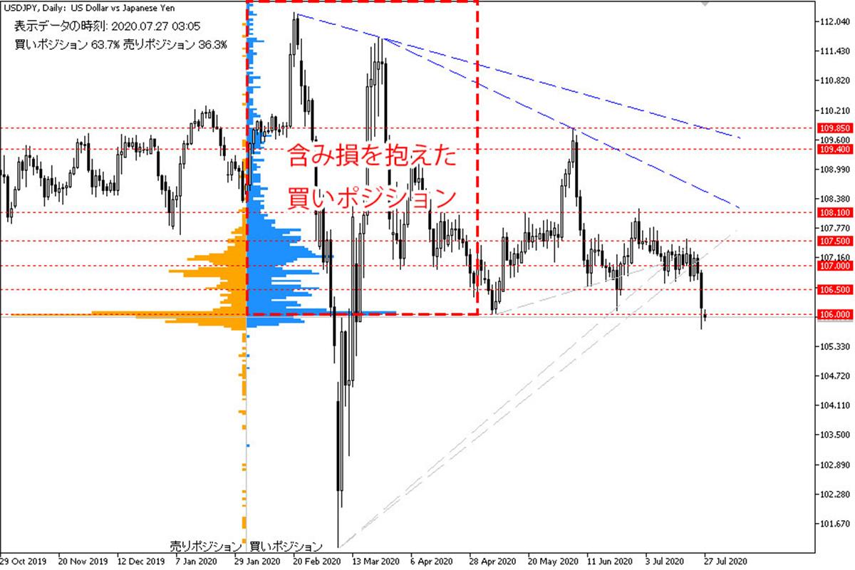 OANDAのオープンポジションを見ると、買いポジションの比率が6割を超える中、その多くが含み損を抱えている状況です。