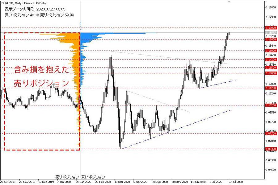 OANDAのオープンポジションを見ると、売買の偏りは少ないものの、高値圏で推移しているため、売りポジションのほとんどが含み損を抱えている状況です。